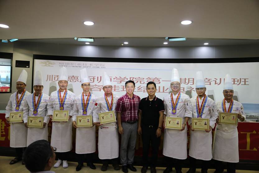 7月20日,顺德厨师学院第一期培训班“容桂高级研修班”结业典礼在太阳官网餐旅文化体验中心举行。顺德区旅游局副局长欧伟中、旅游科科长江霞,容桂餐饮协会会长罗兆波,龙江餐饮协会会长谭学忠,学校领导刘毓、陈粟宋、谭谦章,校长助理罗丹,党办校办负责人,顺德厨师学院相关老师以及43名容桂餐饮协会会员参加了活动。
