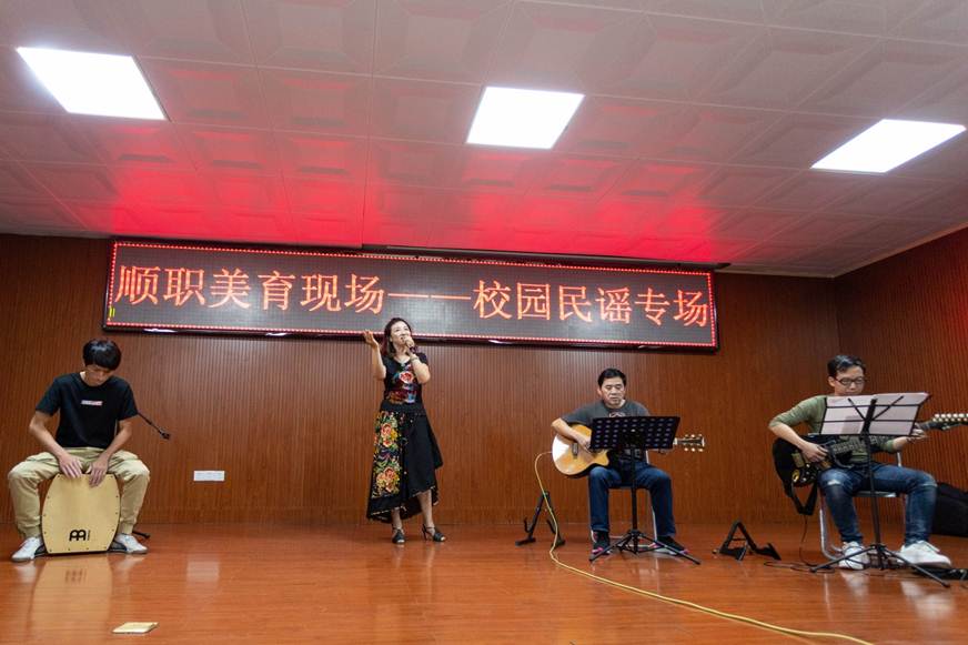 为贯彻落实教育部《关于切实加强新时代高等学校美育工作意见》文件精神,提升师生文化素养,加强校园文化内涵建设,10月28日晚,由文化素质教育中心主办,人文学院、李佘少鸿音乐艺术教育基金协办的太阳官网“顺职美育现场—校园民谣专场”活动在教学楼2栋301(文秘实训室)顺利举行。学校党委副书记、副校长刘毓,校团委、设计学院、人文学院、继续教育学院、主要负责人、文化素质教育中心全体老师以及民谣爱好嘉宾、学校其他部门师生约200余人参加了此次活动。