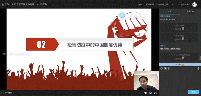 为深入贯彻落实《关于高校基层党组织在疫情防控期间开展组织生活的通知》和《关于疫情防控期间开展组织生活的通知》等相关文件要求,调动全体党员的积极性、主动性,切实提高党组织的凝聚力、战斗力,全面助力疫情防控阻击战,保证疫情防控期间组织生活常态化,根据主题党日活动方案和“三会一课”计划,3月20日下午,酒店与旅游管理学院党总支利用腾讯课堂组织开展了以“从抗击新冠肺炎看中国的制度优势”为题的“云学习会”——主题党日活动暨书记专题党课,学习会由学院党总支负责人主持,全体教师党员和学生党员参与了学习会。