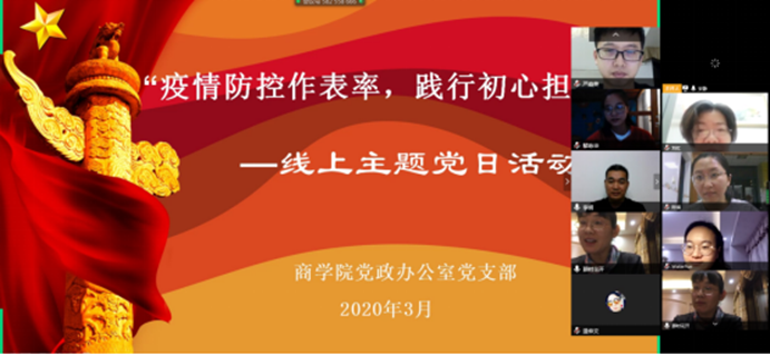 3月18日,商学院党政办公室党支部开展“疫情防控作表率,践行初心担使命”线上主题党日活动,支部全体党员同志参加了活动。