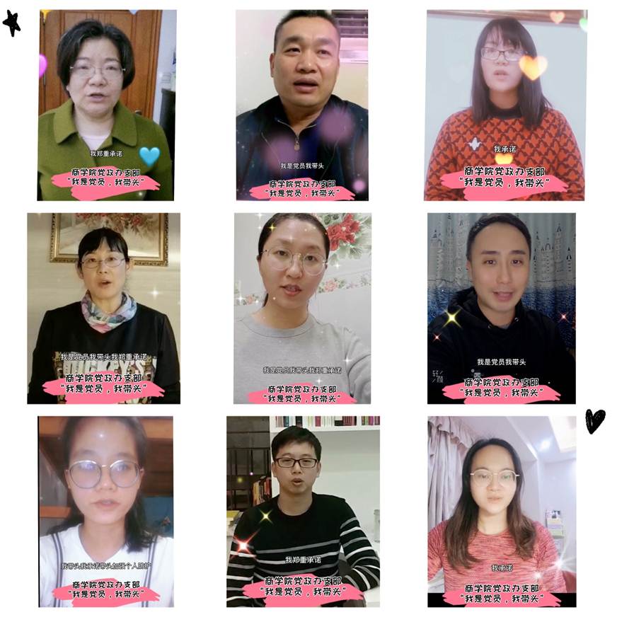 晚上8时,商学院党政办公室党支部全体党员,准时进入腾讯会议,通过视频参加本次线上主题党日活动。党支部书记主持了本次活动。活动主要对新型冠状病毒疫情防控的精神和代表人物的事迹进行了集中学习,并进行了经验分享。首先,在重温入党誓词后,党员同志集中观看《学习强国》平台上钟南山、李兰娟等先进人物的感人事迹,学习他们大无畏的奉献精神,进行自我鞭策,争当优秀共产党员。随后,支部优秀党员严嘉荣、陈琪同志作为先进代表,分享了疫情防控中的工作心得,他们鼓励支部党员应该“不忘初心、牢记使命”,立足本职工作,在疫情防控中作表率。接着,支部党员纷纷结合身边感动的人与事,分享疫情期间个人工作、生活感受和学习心得。最后,支部党员互相鼓励、网络传心,用手比心传递爱,送出大家真挚地祝福,并逐一宣读《“我是党员我带头”》承诺书。