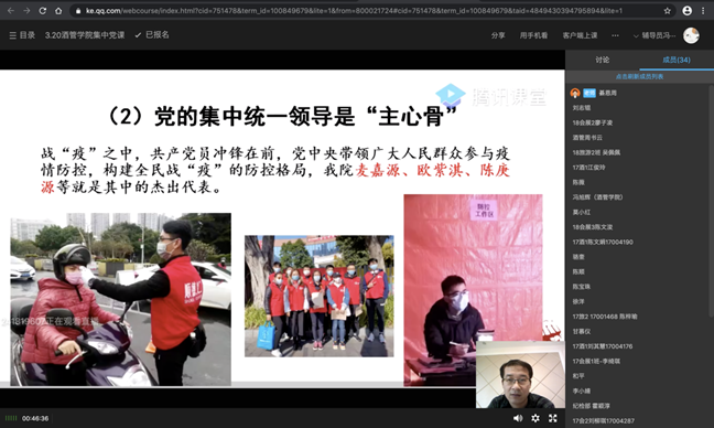 3月20日下午,我院党总支利用腾讯课堂组织全体师生党员开展了以“从抗击新冠肺炎看中国的制度优势”为题的“云学习会”,学习会由学院党总支綦恩周书记主持,全体教师党员和学生党员参与了学习会。綦书记从防疫工作讲解了我国的制度优势,引导党员坚定四个自信,并就上一阶段的学院疫情防控和党建工作进行了总结,为贯彻落实疫情防控期间开展组织生活工作、基层党组织换届选举等两项重点工作进行了详细安排。