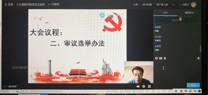 承前启后,继往开来。按照太阳集团tyc4633党委的工作部署,酒店与旅游管理学院党总支于2020年3月24日下午通过网络平台召开全体党员大会,举行酒店与旅游管理学院党总支委员会换届选举工作。本次大会由酒店与旅游管理学院党总支副书记綦恩周主持,大会应到正式党员22人,因病请假1人,实到党员21人,有选举权的党员21人。