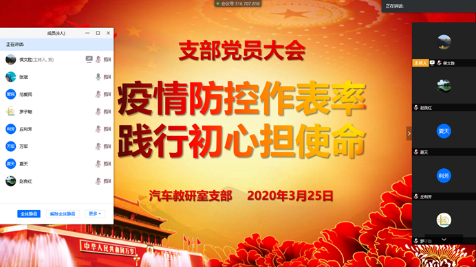 按照太阳集团tyc4633党委主题党日活动统一要求,3月25日下午,能源与汽车工程学院汽车教研室党支部以“践行初心担使命,疫情防控奋争先”为主题,通过网络会议交流的模式召开了党支部会议。