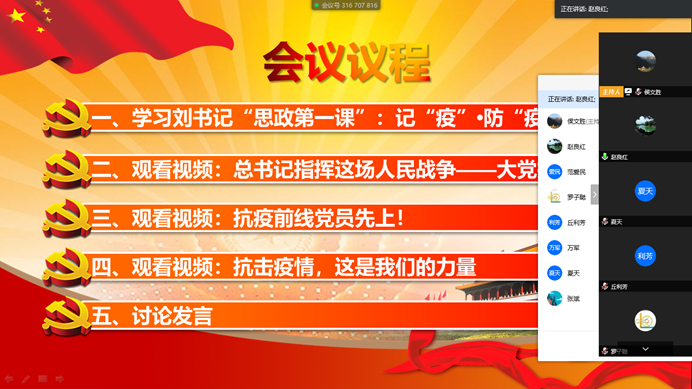 首先学习了学校党委副书记、副校长刘毓主讲“思政第一课”——记“疫”•防“疫”•思“疫”;然后观看了“总书记指挥这场人民战争——大党担当”、“抗疫前线党员先上!上海医疗组专家:要把人民的利益放在第一位”、“抗击疫情,这是我们的力量”相关视频片段;最后大家各抒己见,积极发言,交流学习心得。