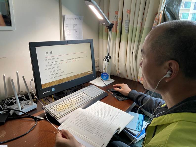 2月17日起,人文课程教研室的线上教学全面展开。老师们按照自己的线上授课方案有条不紊地开展教学。每个老师都根据自己的条件和情况选择了最佳的教学方案。对于张滴珍、陆可成这样的老教师而言,教学经验丰富是她们的优势,而信息技术薄弱是她们的软肋。张老师面对困难,迎难而上,不惜动用高级技术人才的儿子教她录网课,让饶晓明老师帮她发布作业。自己录讲解音频发到学习群。谢蔚老师一边照顾生病的母亲,一边在老公的帮助下学习录制网课。陆可成老师则是在身处香港的女儿的远程帮助下完成了视频的录制。王亮老师作为人文教师中为数不多的信息技术高手,给大家提供了视频录制教程和视频压缩服务。饶晓明老师在前三周时间里学习并采用了QQ、沃米易学、腾讯课堂三个平台进行直播。然后根据学生的反馈和平台的功能,最后稳定在用腾讯课堂进行网络直播,用太阳集团tyc4633在线教育综合平台布置学习任务和课程作业,进行在线测试。因为女儿面临高考,每天都在上着网课,所以他每次直播都要找个宁静的角落。