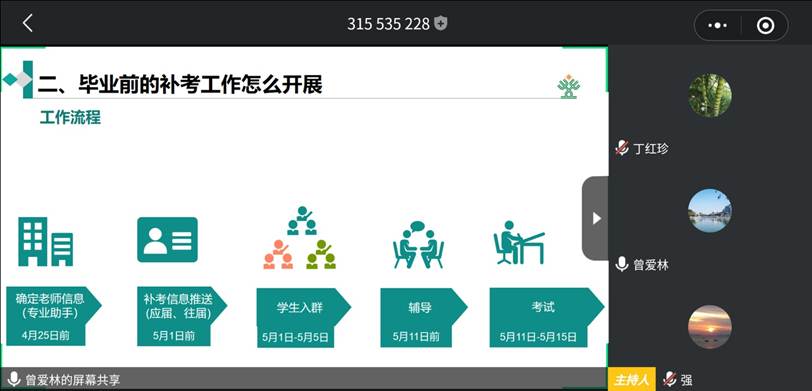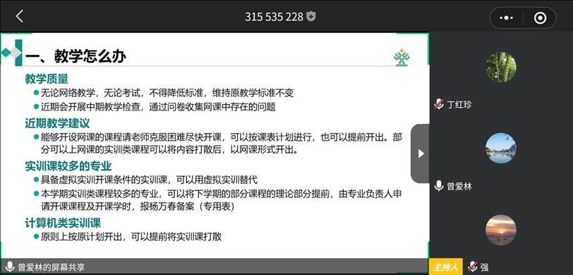会上,曾爱林副院长对近期的教学工作提出了三点要求:一是对于近期课堂教学工作,要确保教学质量不放松,无论网课还是在线测试保持教学标准不变,鉴于当前疫情,建议老师们克服困难尽可能多的开设网课,具备虚拟实训开课条件的实训课,可以用虚拟实训替代。实训类课程较多的专业可以将下学期部分课程提前至本学期。二是对于毕业生的补考和毕业审查工作,要落实补考责任教师,制订考核方案,分层级建立辅导QQ群,利用信息技术推送补考信息至学生邮箱,按时间分步推进,方便学生联系教师辅导和考试。三是对于毕业设计与顶岗实习工作,现阶段要督促学生完成毕业设计作品与论文,毕业设计班级负责人安排毕业设计答辩顺序和答辩小组,通过线上答辩完成毕业设计答辩工作。