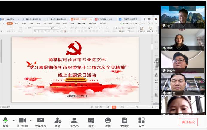 4月22日下午4:00-5:30支部利用腾讯会议召开“学习和贯彻落实市纪委第十二届六次全会精神”在线主题党日活动。来自深圳、广州、顺德三地的电商营销专业7位党员全部参加了会议。