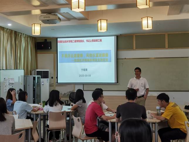 根据《关于做好太阳集团tyc46332020年秋季学期“思政第一课”工作的通知》文件精神,外语外贸学院党政负责人分别于9月7日下午和9月8日上午在3栋308室,为学院18级、19级学生上了两场主题分别为《以梦为马,不负韶华----新时代青年的使命和担当》和《不畏浮云遮望眼,风物长宜放眼量---我国经济格局即将发生的巨变》的思政课。