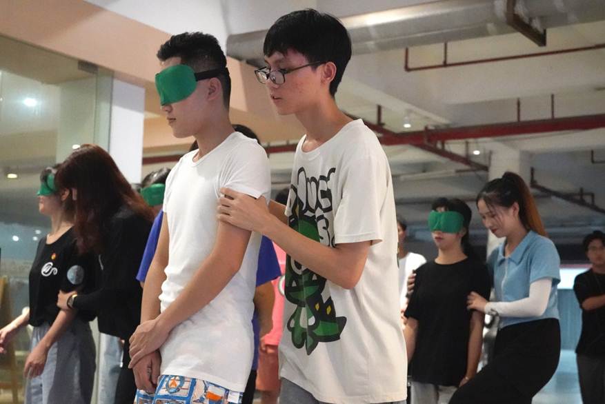 最后,培训通过“盲人障碍”两两组队的游戏方式,互相体验引领者的不易,让同学们在配合过程当中互相增进了信任,提高了默契。两个多小时的团体心理辅导培训在愉快的氛围中走到了尾声。