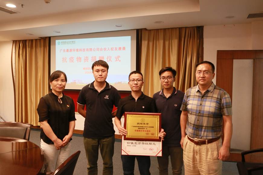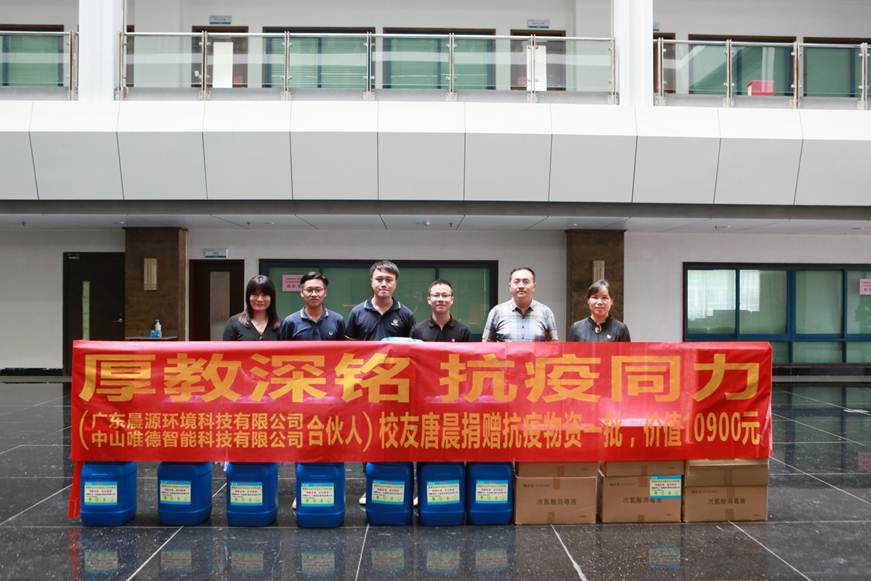 厚教深铭,抗疫同力。2020年6月29日下午,广东晨源环境科技有限公司合伙人、校友唐晨(2015级工业分析与检验专业)向母校捐赠防疫物资仪式在行政楼508会议室举行。校友唐晨、欧阳伟强、黄鑫杰,轻化与材料学院党总支书记仲玉梅、校友会基金会秘书处秘书长董国顺、副秘书长傅银燕及相关老师参加了活动。