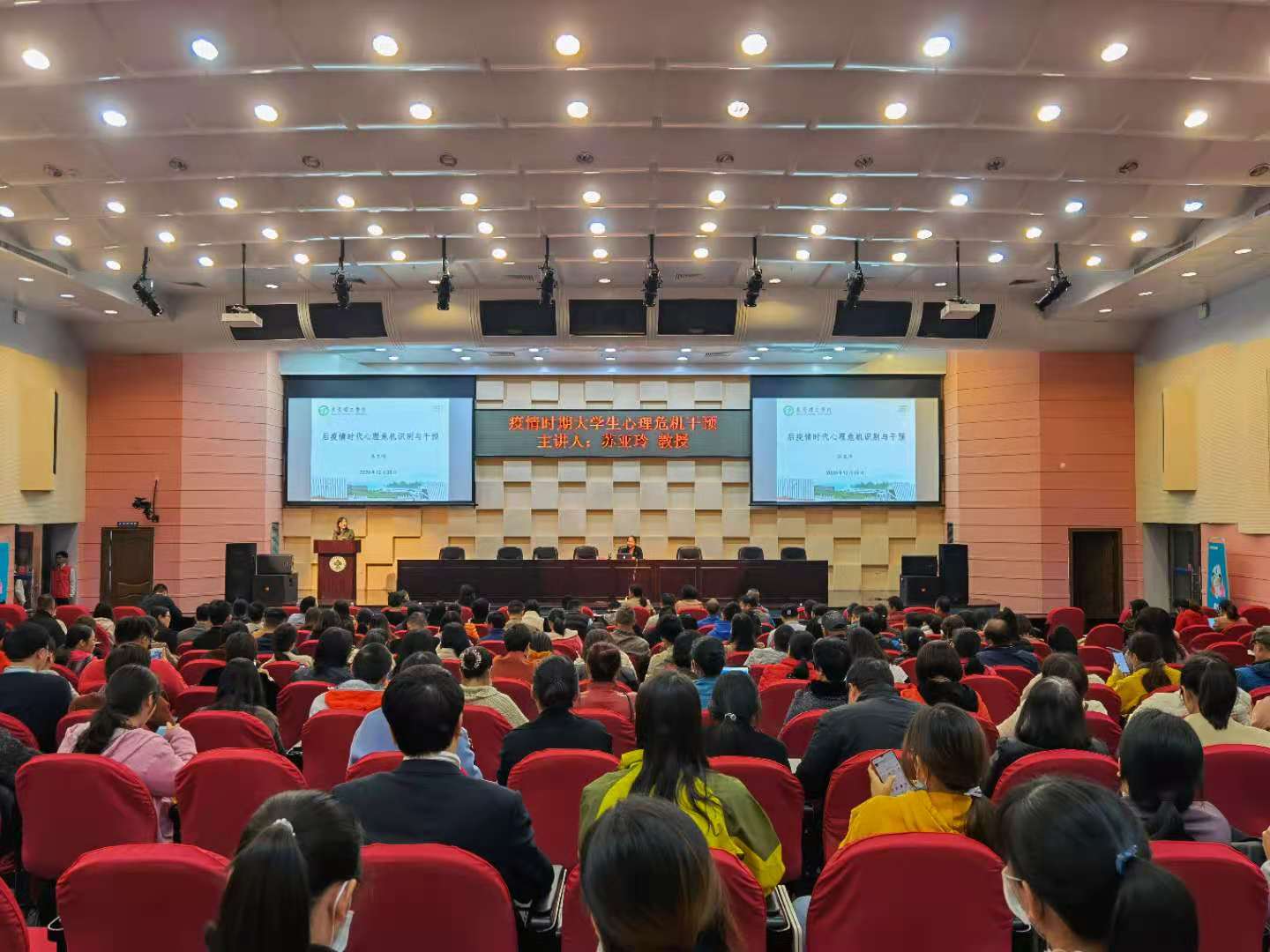 为了进一步贯彻落实《广东省教育厅关于切实加强2020年秋季学期高校学生心理危机预防与干预工作的通知》的文件精神,提升太阳官网师生心理健康教育水平,提高教职员工对大学生心理问题的认知能力和干预技能。12月8日,学校在学术报告厅举行了“大学生心理危机干预”专题培训讲座。邀请了教育部高校辅导员培训与研修基地首席专家、广东省教育厅突发事件应急管理心理专家、广东省高校心理健康教育与咨询专业委员会副主任、东莞理工学院苏亚玲教授作了专题辅导报告。各二级学院党总支书记、辅导员、班主任、学校舍务管理人员以及学生工作部有关人员近300人共同聆听了讲座。讲座由学生工作部部长陈春艳主持。