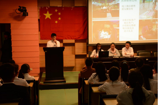 活动在奏唱团歌中拉开序幕。前期,经过火热的初赛、复赛,共有8组参赛队伍杀进决赛展开角逐。紧接着,主持人宣读大赛规则,比赛正式开始。每组参赛队伍以PPT+视频的形式进行项目汇报,然后进入答辩环节。赛后,评委进行点评,高凤荣老师首先对参赛选手们表示了肯定,接着引导大家思考营销的技巧,希望选手们营销时考虑目标人群并针对不同人群运用不同方式让对方产生购买欲望。同时,希望以手制“爱”,创意营销比赛结束后,爱要持续下去,献爱永不停步。由流管理专业的几位学生组成的六硬团队、市场营销专业和电子商务专业的几位同学组成的潮汕大户队,他们的表现受到评委老师们的一致好评,众望所归,摘得一等奖。