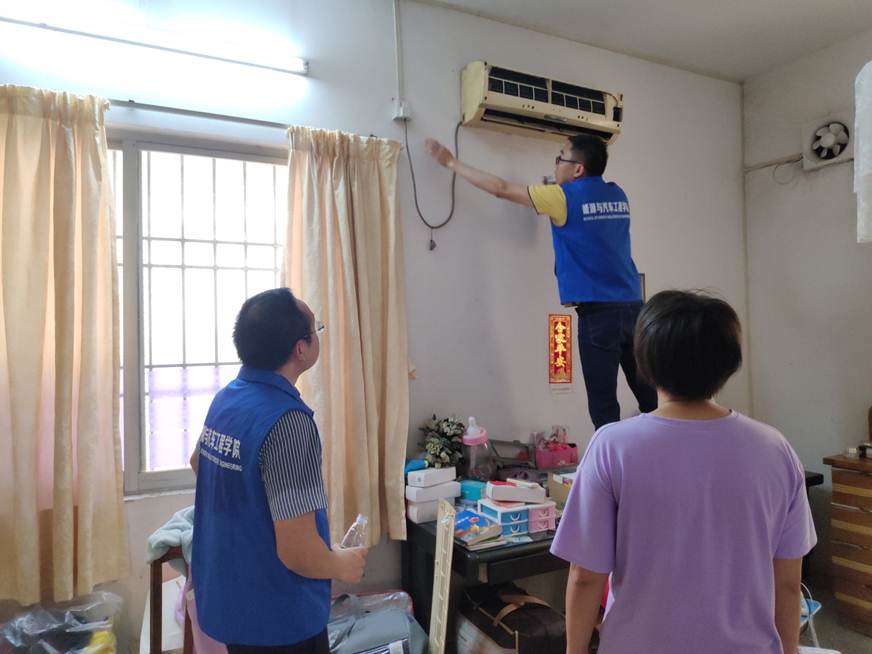 院长余华明带领其他党员与顺德区人大支部党员一起,在苏岗居委会支部党员的带领下,亲自上门为居民户上门进行空调清洁养护,为居民普及在疫情防控下如何做好空气质量环境的清洁养护问题。