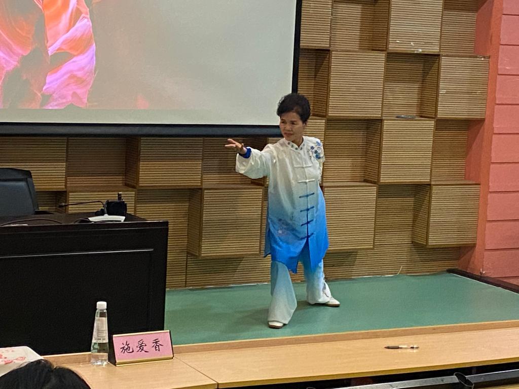 讲座中场休息期间,甘肃省太极协会副会长、陈氏太极拳小架第十二代传人施爱香女士还为师生们表演了精彩的陈氏太极拳老架一路。讲座结束后李教授为部分老师进行了现场把脉。