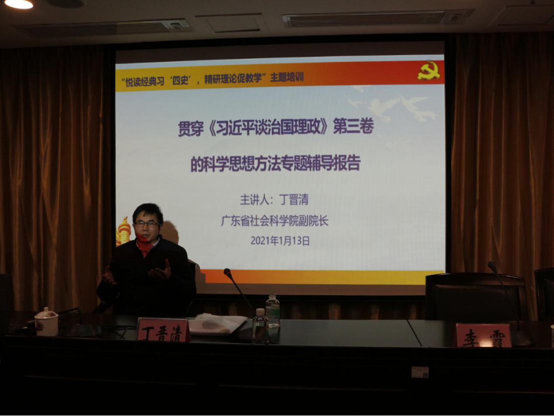 1月13日,培训以省社会科学院丁晋清副院长的“贯穿《习近平谈治国理政》(第三卷)的科学思想方法”及“申报思政课题应遵循的基本原则”两场报告拉开序幕。丁晋清副院长结合自己的学习体会,总结了贯穿《习近平谈治国理政》(第三卷)的八种科学思想方法、六种科学思维能力、三种科学理念,讲座系统性强,信息量大,理论分析透彻,讲解生动深刻,为老师们悦读经典习“四史"提供了系统科学的学习方法。在第二场报告中,丁晋清副院长认为,申报课题要成功,一是要遵循学术规范;二是要结合中心工作,结合习近平总书记新思想挖掘选题;三是要发挥自己的专业优势,做到扬长避短;四是要有特色和创新,避免雷同和炒冷饭;五是要站在学术前沿;六是要有一定的学术积淀;七是要有问题意识。同时,丁晋清副院长根据以上原则,围绕学习党的十九届五中全会精神、建党100周年、顺德高质量发展等即时提供了十二个选题供大家参考,为老师们的课题申报提供极大帮助。大家普遍认为该报告及时给力,使人受益匪浅。