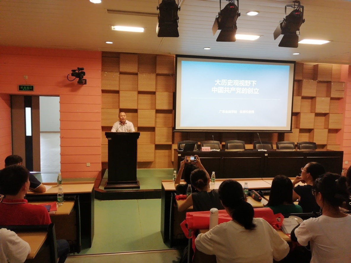 朱培松教授以《大历史观视野下中国共产党的创立》为主题,引用著名学者黄仁宇的“大历史观”理论分析中华文明发展史与世界文明发展史、中国共产党的创立过程以及对西方文明的反思。朱教授对于党史研究不仅仅停留在书本学习,同时成体系的实地调研了国内190多个城市的200多个红色景点,分享了“游中学、学中游,寓教于游、润心无声”的党史学习方法。在讲座中,他引用详实的史料,通过严谨而又风趣的语言向师生们介绍了中国共产党创立的过程,新文化运动主要领导人物之前的脉络关系,讲述了毛泽东早期在北大的学习经历,李大钊和陈独秀创立共产党的过程,引用鲁迅经典著作中的代表人物润土和孔乙己的故事,以小见大,阐明了在中国共产党的带领下国家走向富强的历史,希望师生们坚定“四个自信”。