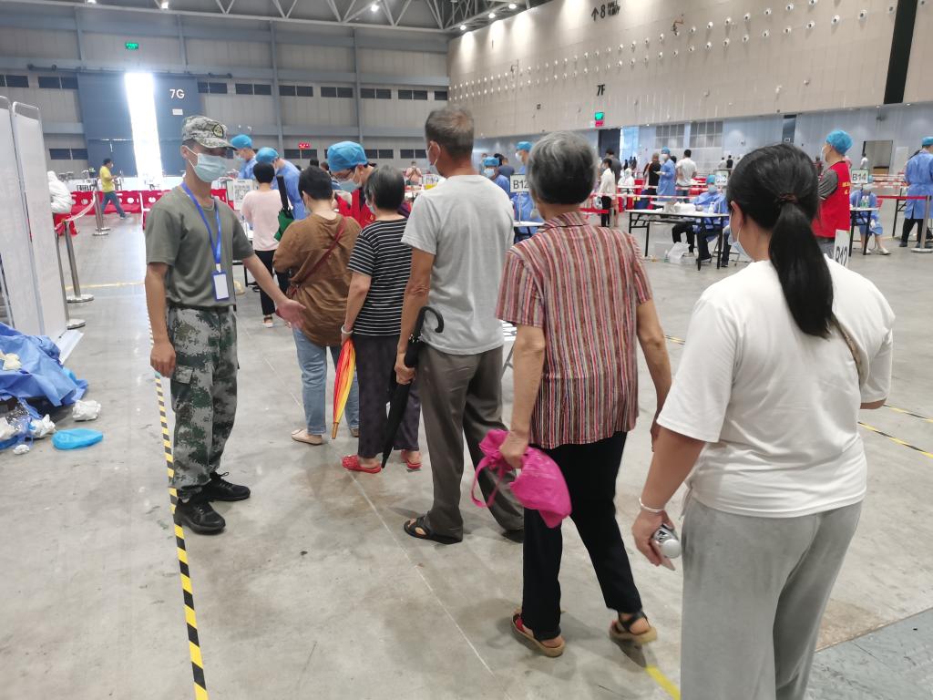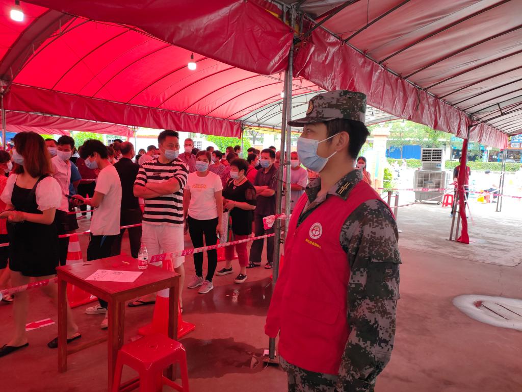 根据安排,梁梓龙在潭洲国际会展中心核酸检测点参与志愿服务。检测开始前,他与社区工作人员、志愿者们一起,将每一个水马、每一个锥桶、每一张桌椅摆放到位。检测开始后,他协助维持秩序、测量体温、分流引导,每天从早上8点工作到晚上23点。期间,梁梓龙主动帮助市民用手机提前填写信息;遇到没有家人陪同、没有智能手机的老人,他就拿出自己的手机帮老人填好资料,陪同他们完成检测。虽然长时间连续作战,中间休息的时间不多,但梁梓龙始终保持精力充沛的状态,他说:“大量医务人员、党员干部、志愿者都坚守在疫情防控一线,作为一名在校大学生和退役士兵,能以民兵身份为社会出一份力,做些力所能及的事,我心里就踏实了。”