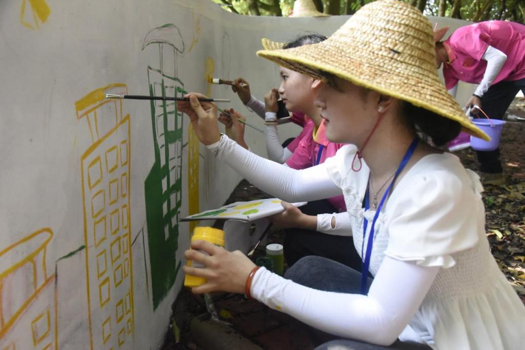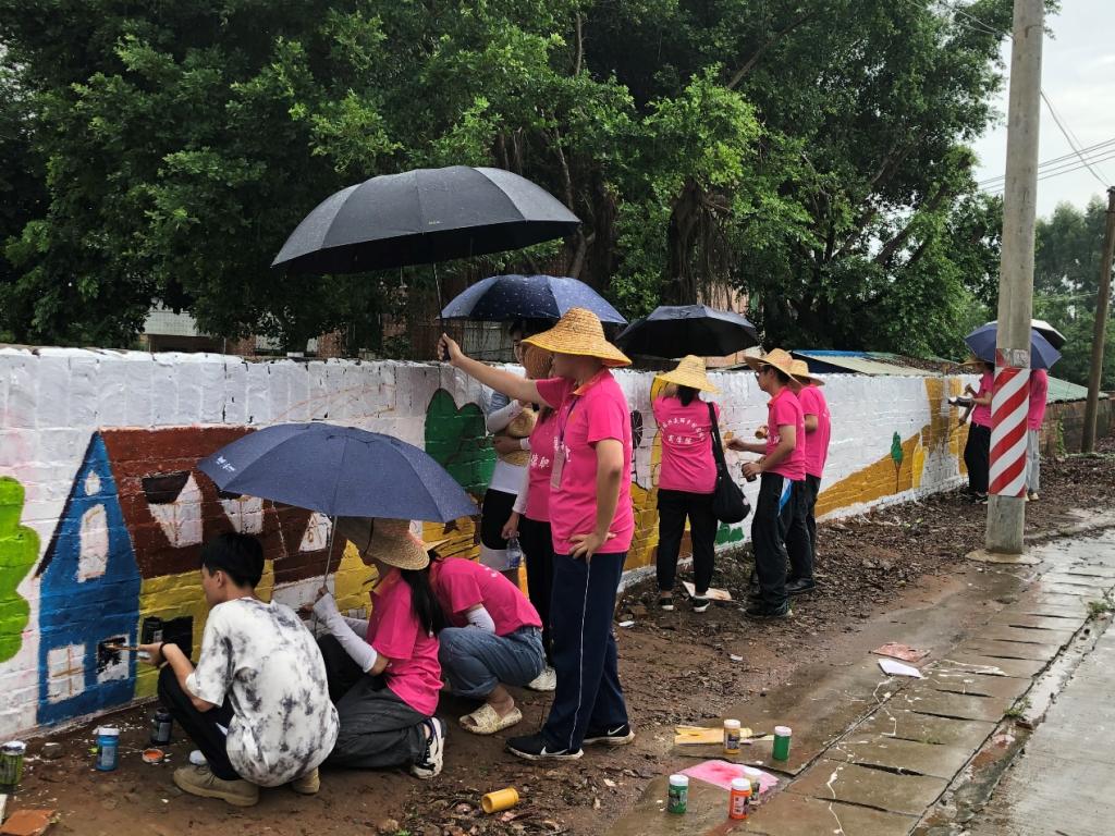 实践队一行首先来到遂溪县建新镇土札村开展文化墙绘制活动。此次绘制的墙体面积1000平方米,主要分布在中心公园及土札小学,均是村民常去之地。队员们克服高温湿热、台风天气等影响,发扬不怕苦不怕累的精神,一天12小时高强度工作。起稿、勾线、涂色、修边……墙面在队员们的一笔一画中逐渐变得生动而鲜活。