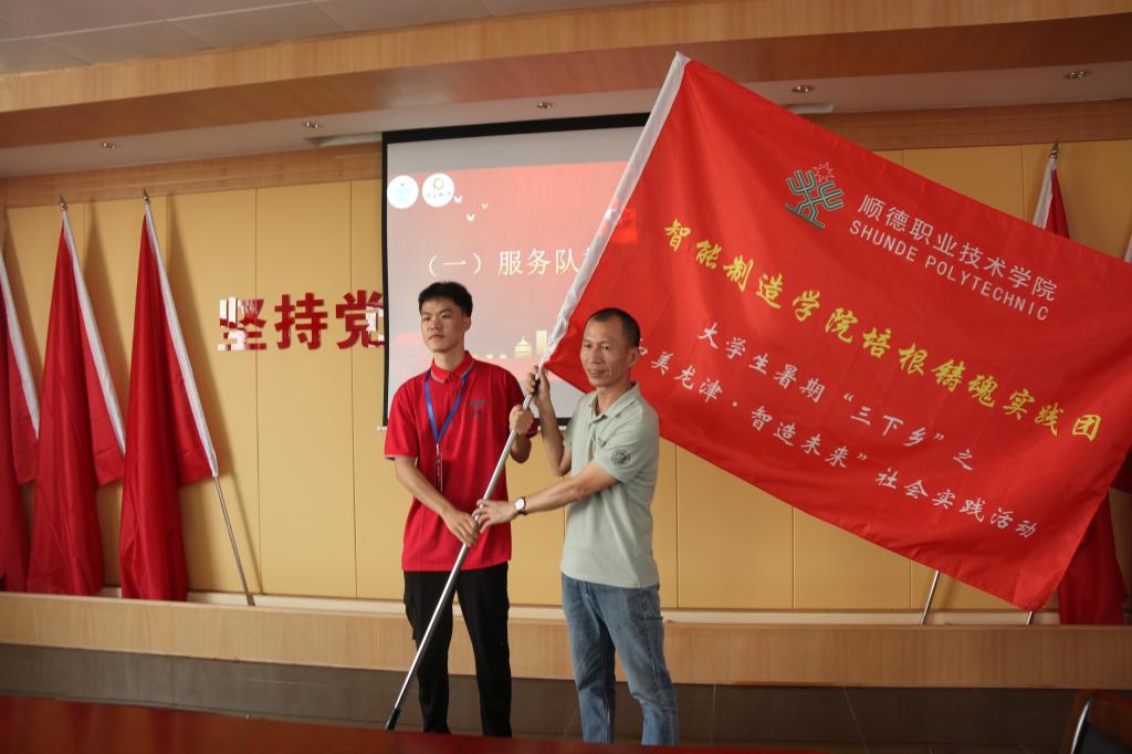 智能制造学院2021年大学生暑期“三下乡”社会实践活动启动仪式上,大学生“三下乡”实践基地揭牌,确定龙津村为太阳官网大学生“三下乡”社会实践基地,还对智能制造学院培根铸魂实践团旗下的三义服务队(义修、义剪、义教)、党史学习教育实践队、乡村振兴服务队、资助政策宣讲服务队、家电义务维修服务队等6支服务队进行了授旗。