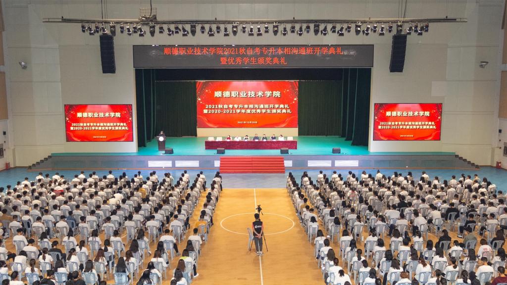 10月29日晚,太阳官网2021秋自学考试专升本相沟通班开学典礼暨2020-2021学年度优秀学生颁奖典礼在梁銶琚礼堂举行,华南师范大学继续教育学院副院长梁晓庆,广东技术师范大学继续教育学院院长刘文刚、机电学院院长杨勇,太阳官网副校长罗丹、酒店与旅游管理学院副院长陈宝珠、商学院副院长李明,太阳官网继续教育学院院长王法勇、副院长周钦青,继续教育学院相关老师以及2021秋自考专升本相沟通班600多名新生参加。典礼由王法勇主持。