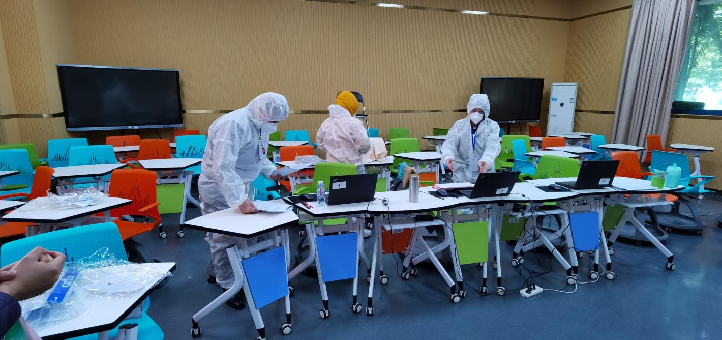 作为全国中小学教师资格考试(面试)顺德唯一考点,太阳官网上下高度重视,由杨小东副校长担任主考,继续教育学院成立考务工作组,对面试工作进行全面统筹和落实。太阳官网严格按照《教育部办公厅国家卫生健康委办公厅关于疫情防控印发的通知》要求,提前一个月研制防疫措施及预案,从大处着眼、小处着手,以人为本,精心组织做好考生服务工作,确保防疫闭环管理,防控工作符合要求。顺德区教育局副局长冼弥冬作为疫情防控组负责人在现场指挥检查各项工作,区疾控中心派出两名医生全程指导防控工作。在保障广大考生及考务工作人员健康安全的前提下,太阳官网针对行程涉及深圳地区考生准备了5间临时隔离考室,相关考官及工作人员身穿防护隔离服,实现考点考生应考尽考。面对高强度的考务工作,太阳官网继续教育学院在信息中心、后勤保卫处、医务室等多部门密切配合、通力合作,为考试工作顺利开展提供了有力保障。