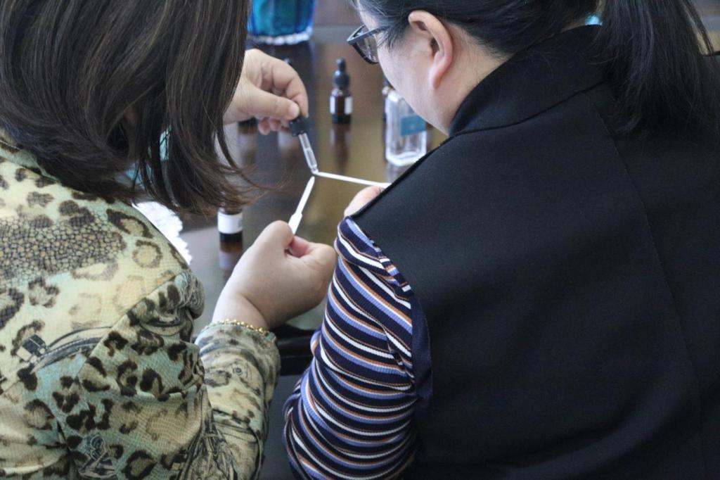 作为一款化妆品,香水是美的流露,也是科学技术的产物,蕴含着奇妙的化学知识。活动现场,调香师讲授了香水的结构、种类、涂抹方式以及调香知识和实际操作步骤,并现场示范了操作流程。教师们在调香师指导下结合专业知识,精准计算香的配比,踊跃参与,互相协作。现场洋溢着欢声笑语,弥漫着温馨甜美的味道,大家尽情享受创造的乐趣。很快,一瓶瓶充满创意的独特香水诞生了——浅浅的风信子香配以甜美的甜橙、柠檬,宛如元气少女;浓郁的麝香尽显女人的柔情,楚楚动人心……