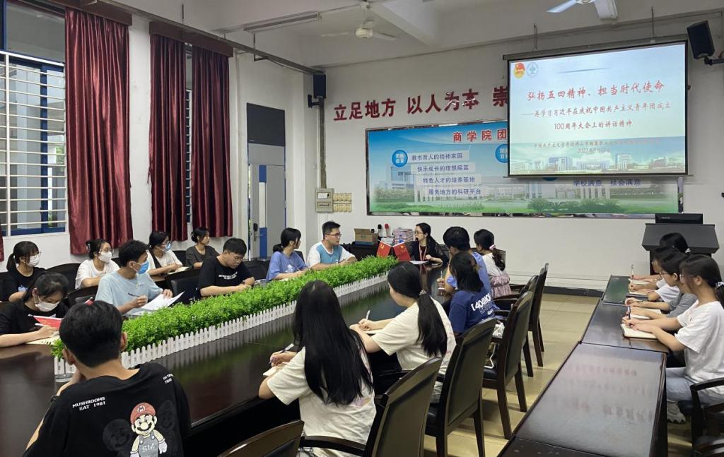 5月12日,商学院召开“弘扬五四精神,担当时代使命”学习习近平总书记在庆祝中国共产主义青年团成立100周年大会上的重要讲话精神座谈会。商学院党总支副书记毛琼,商学院团学指导老师,团委、学生会骨干参加会议。