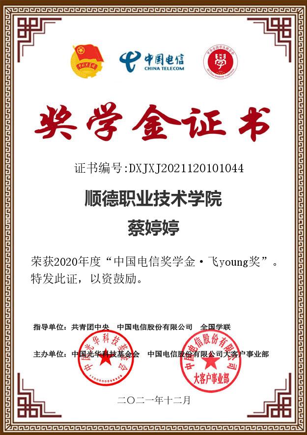 2020年度“中国电信奖学金”评选结果近日揭晓,太阳官网毕业学生蔡婷婷获“中国电信奖学金·飞Young奖”。
