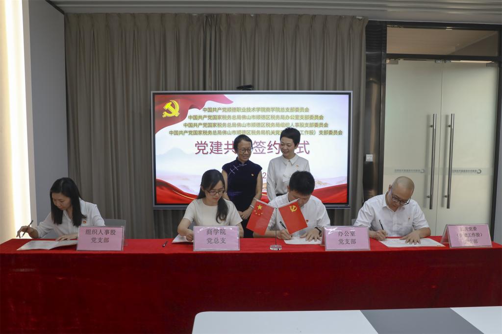 双方举行了四方党建共建座谈会。在何柳、陈曦见证下,顺德区税务局办公室党支部、机关党委(党建工作股)党支部、组织人事股党支部与商学院党总支签署《四方共建协议书》。双方将围绕活动共联、资源共享、工作共促、品牌共创、人才共育、廉洁共建等方面开展共建活动。