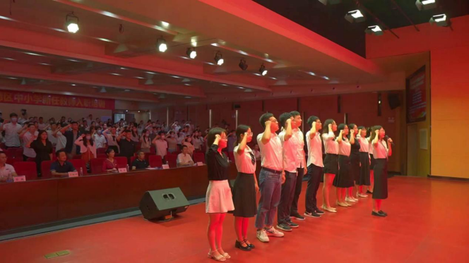 随后,新教师代表接受入职徽章,全体新教师进行入职宣誓,立志做有理想信念、有道德情操、有扎实学识、有仁爱之心的“四有”好老师,为党育人,为国育才。