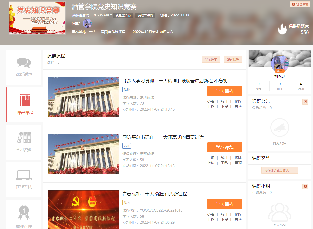 11月7日至12月9日,酒店与旅游管理学院学生党支部围绕“学习二十大永远跟党走奋进新征程”主题,通过易班优课平台组织支部党员、入党积极分子和发展对象参与线上宣讲,深入学习“砥砺奋进启新程,不忘初心担使命”、“青春献礼二十大强国有我新征程”专题党课和习近平总书记重要讲话精神,累计158名师生参与线上学习。