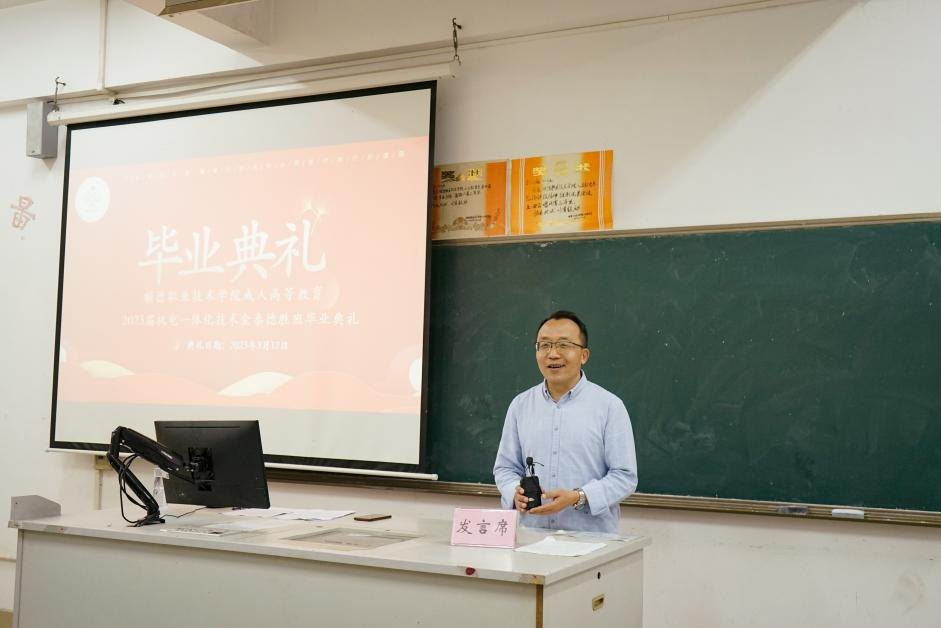 佛山市顺德区金泰德胜电机有限公司运营总监王建平、生产主管王吉平、培训专员谢小玲,太阳官网继续教育学院副院长周钦青、招生培训科科长谢华丰、副科长彭军亮,机电一体化技术金泰德胜班15名毕业生出席典礼。
