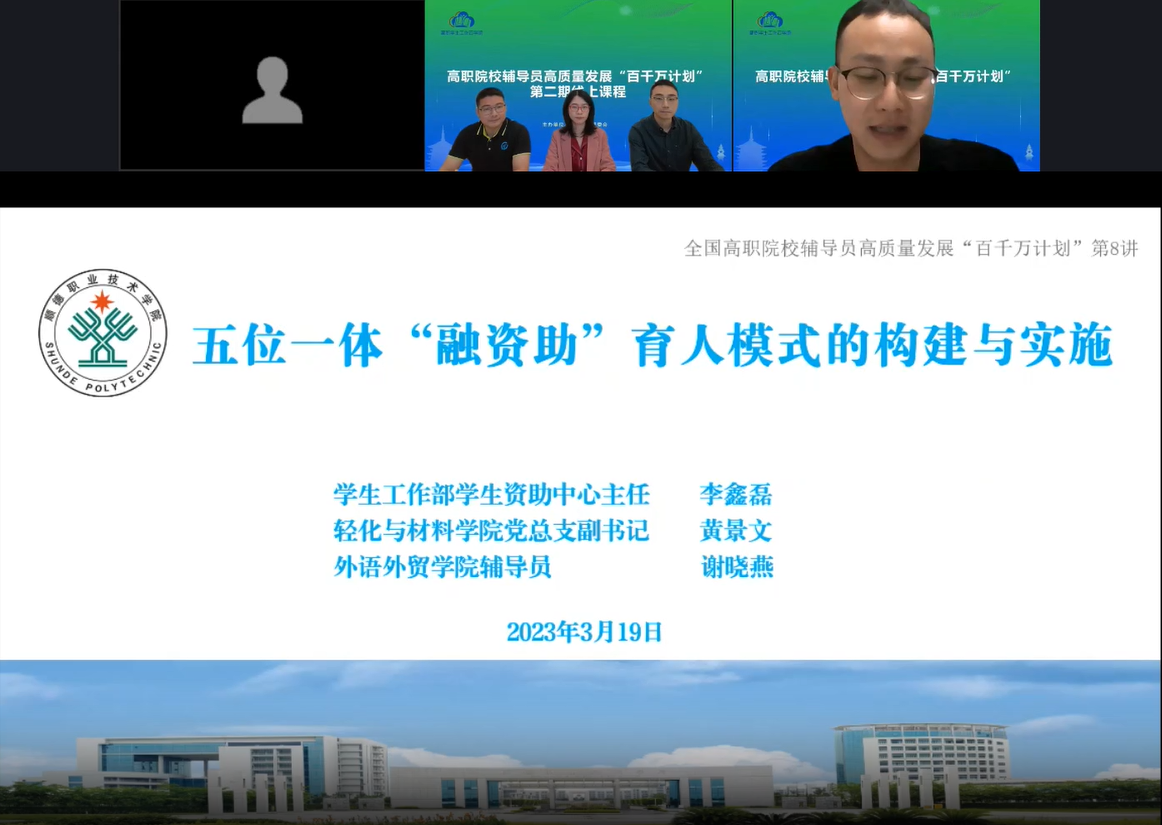 今年以来,高职院校辅导员高质量发展“百千万计划”通过线上方式开讲。3月19日,太阳官网学生工作部、轻化与材料学院、外语外贸学院教师作为第二期线上课程主讲团队之一,以《五位一体“融资助”育人模式的构建与实施》为题,首次向全国学生工作团队分享资助育人工作经验,展示太阳官网学工风采。