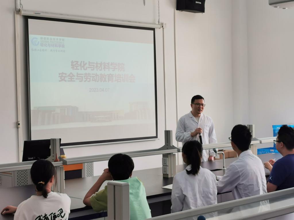 为落实教育部办公厅关于组织开展2023年度高等学校实验室安全检查工作的部署要求,进一步提升轻化与材料学院化学实验实训室安全管理水平及安全规范,确保师生安全,4月7日,轻化与材料学院举办实验室安全与劳动教育启动仪式和培训会。轻化与材料学院副院长刘锋,实训中心全体老师、教师党员、在校17个班级的班干部代表参加活动。