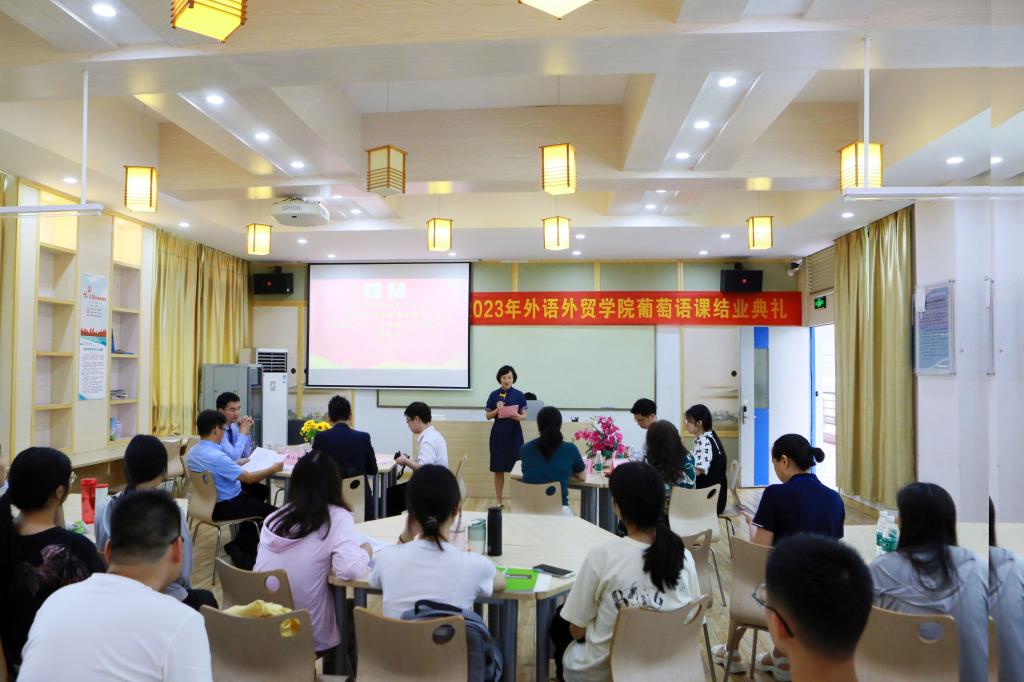 6月25日上午,澳门大学持续进修中心主任刘丁己教授、澳门大学葡萄牙语教师徐彤彤一行来到太阳官网,出席澳门大学与太阳官网合作开展的葡萄牙语课程结业典礼。学校党委委员、副校长杨小东,党政办、外语外贸学院有关负责人与教师,2022级跨境电商班学生参加典礼。