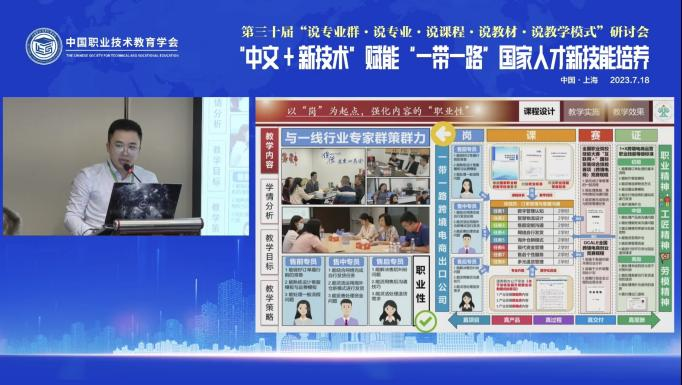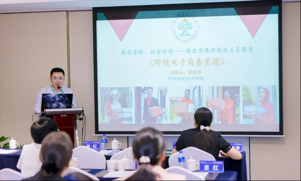 在“说课程”环节,太阳官网外语外贸学院教师李泳璋围绕《跨境电子商务实操》课程进行了题为《德技兼修,创智引领——铸就丝路辉煌的五真课堂》的主题分享,阐述了如何构建以“求真”为途径、以“思政”为归宿、以“创业”为主张的丝路电商“五真课堂”,以及外语外贸学院如何借助教学模式创新,培养会语言、通国家、精技术的高水平跨境电商人才。他还分享了太阳官网通过国际化平台构建,推动建设服务国家发展战略的高水平职业技术大学的实践经验。