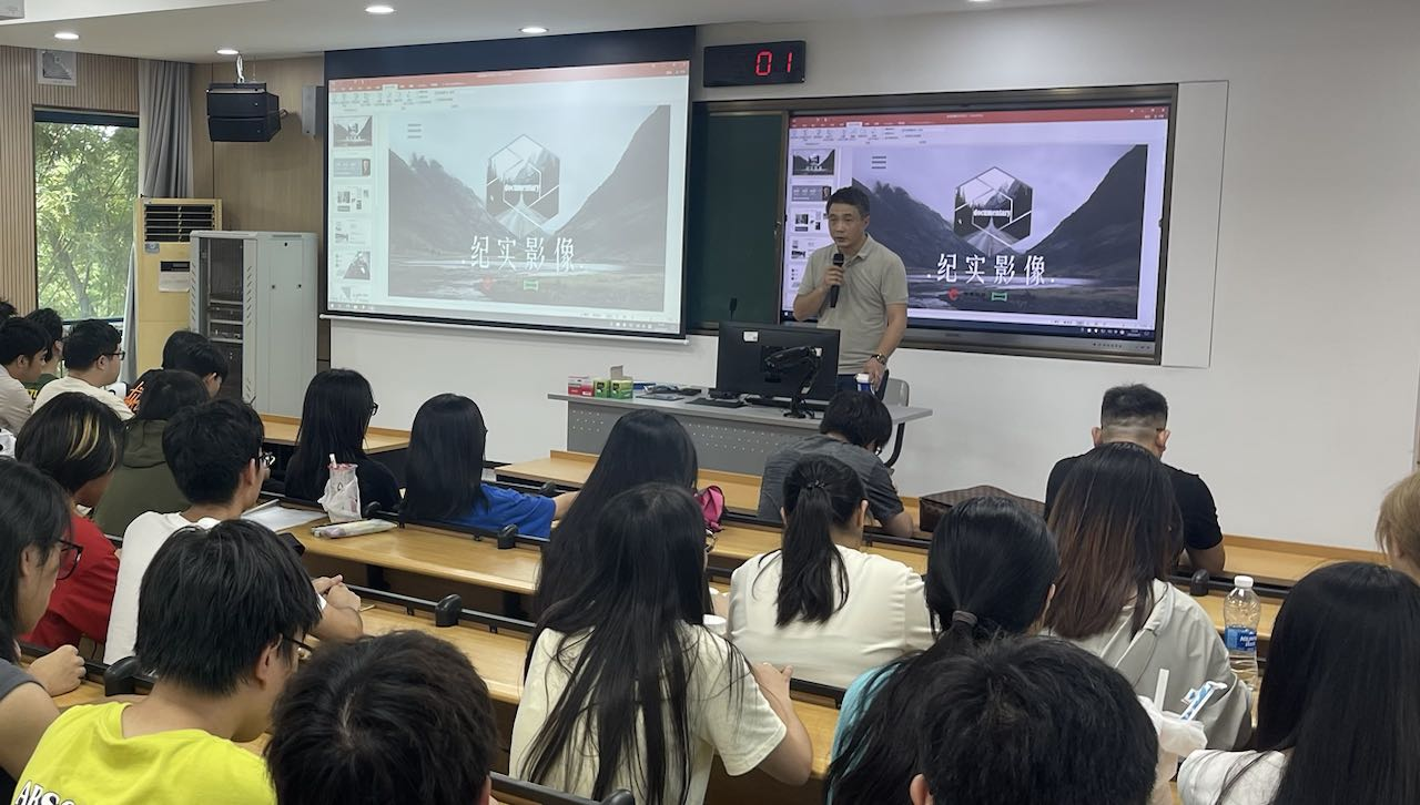 授牌仪式后,钱晓勇为设计学院学生做题为《纪实影像》的专题讲座,讲座以纪录片创作过程作为主线,讲解了纪录片的诞生过程、如何做好非遗主题的调研、纪录片影像制作标准等专业知识,帮助2022级数字媒体艺术设计、视觉传达设计专业学生打好影视艺术项目所需能力基础。