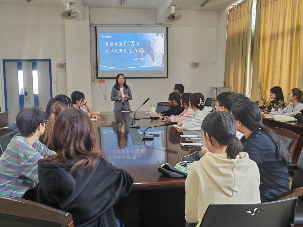 仲玉梅以“当前就业形势与实施就业优先战略”为主题,向同学们介绍了当前我国就业大环境及高校毕业生就业形势,详细介绍了国家对高校毕业生就业、择业的相关扶持政策,并通过对三支一扶、特岗计划、西部计划等政策的讲解,引导同学们树立正确的就业观、择业观。她叮嘱同学们一定要结合专业实习,提前做好个人职业生涯规划,将就业工作前置。