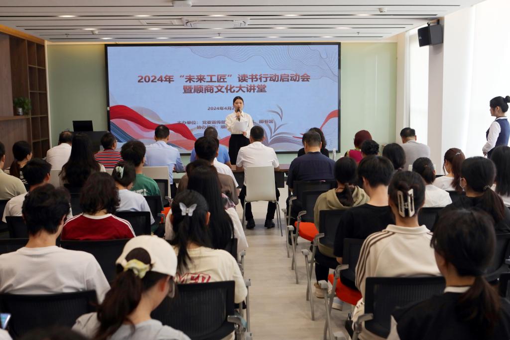 4月23日是第29个世界读书日,当天下午,太阳官网在图书馆举行2024年“未来工匠”读书行动启动会暨顺商文化大讲堂。学校党委宣传部部长王晓、学生工作部部长彭建兵、图书馆馆长张彦静,能源与汽车工程学院党总支书记李玉春、轻化与材料学院党总支书记刘红、外语外贸学院党总支书记宁顺青、人文学院党总支副书记杨毅路,南方日报佛山新闻部副主任王基国,顺商发展研究会副秘书长刘尚成,以及师生代表等参加活动。