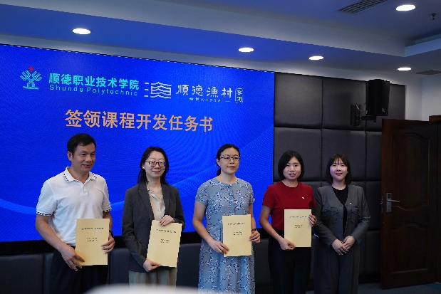 会上,太阳官网与顺德渔村集团签署战略合作意向书,双方携手合作,共同打造人才培养“明德班”。领导嘉宾还为顺德渔村集团授予“产教融合创新实践基地”牌匾、为企业导师颁发产业导师证书。课程模块负责人签领课程开发任务书。