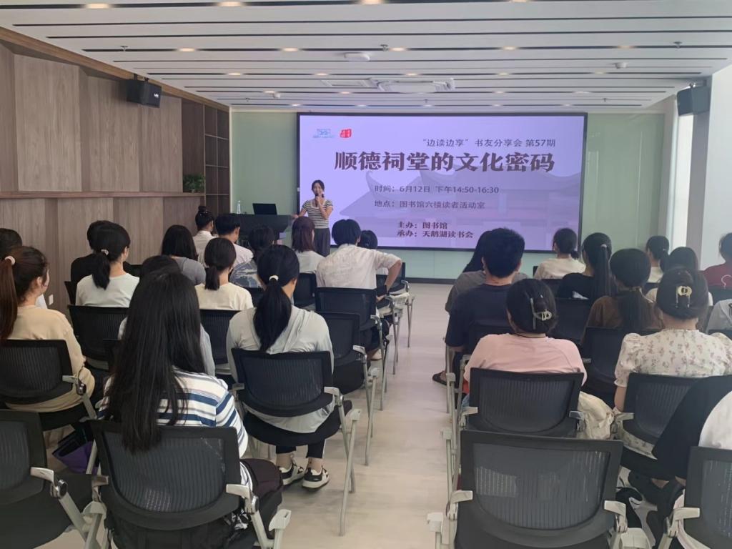 6月12日下午,图书馆第57期“边读边享”书友分享会在图书馆六楼读者活动室举行。本期活动邀请顺德区博物馆欧阳绮文作“顺德祠堂的文化密码”主题分享。