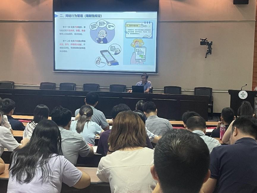 行政二党总支书记陈文海作《中国共产党党员网络行为规范》专题党课,带领党员共同学习2024年1月14日中共中央办公厅发布的《中国共产党党员网络行为规定》。陈文海指出,现今网络空间已经逐渐成为了日常生活的第二空间,但网络空间并非法外之地,身为党员干部我们要树立正确的网络安全观,自觉坚守原则和底线,发挥模范带头作用,走好网上群众路线,谨言慎行,严于律己,传播正能量。