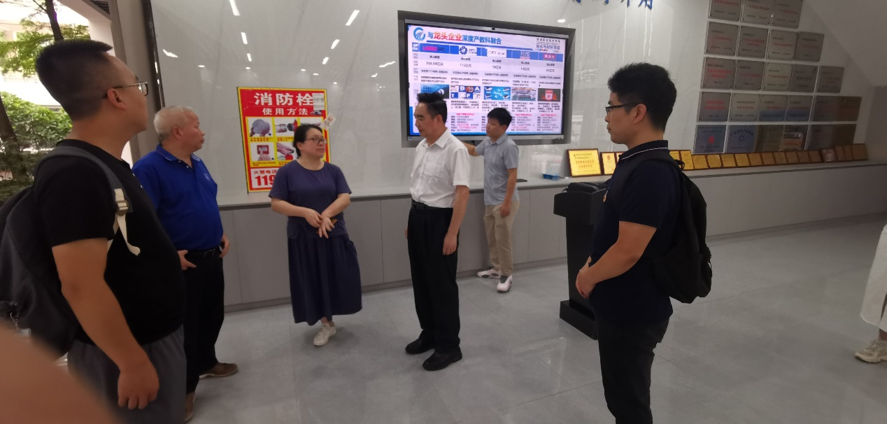 随后,调研团参观了轻化学院实验实训室。陈燕舞详细介绍了学院在建立先进新材料与分析技术应用研究与转化中心方面的实践经验,分享了中心从筹备到运营,再到实现科研成果产业化的全过程,以及这一平台如何实现促进学术研究与实际应用的有效对接,加速科技创新成果在教学和社会服务中的转化。