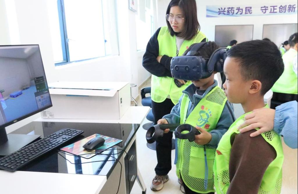 孩子们踏入虚拟仿真实训室,带上VR设备进入虚拟仿真世界,在无菌制药车间中好奇地漫游。医药卫生学院副院长马彦博士用通俗易懂的方式介绍常用药品剂型的分类以及处方药与非处方药的区别。有孩子快乐地说道,“戴上VR设备,仿佛一下子就去到了现代化的制药企业生产车间,亲身体验药品生产的神秘制作过程,感到非常兴奋。”