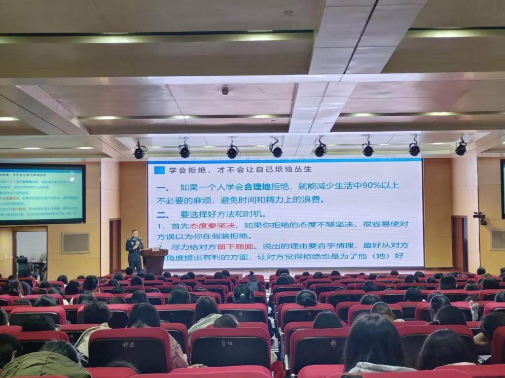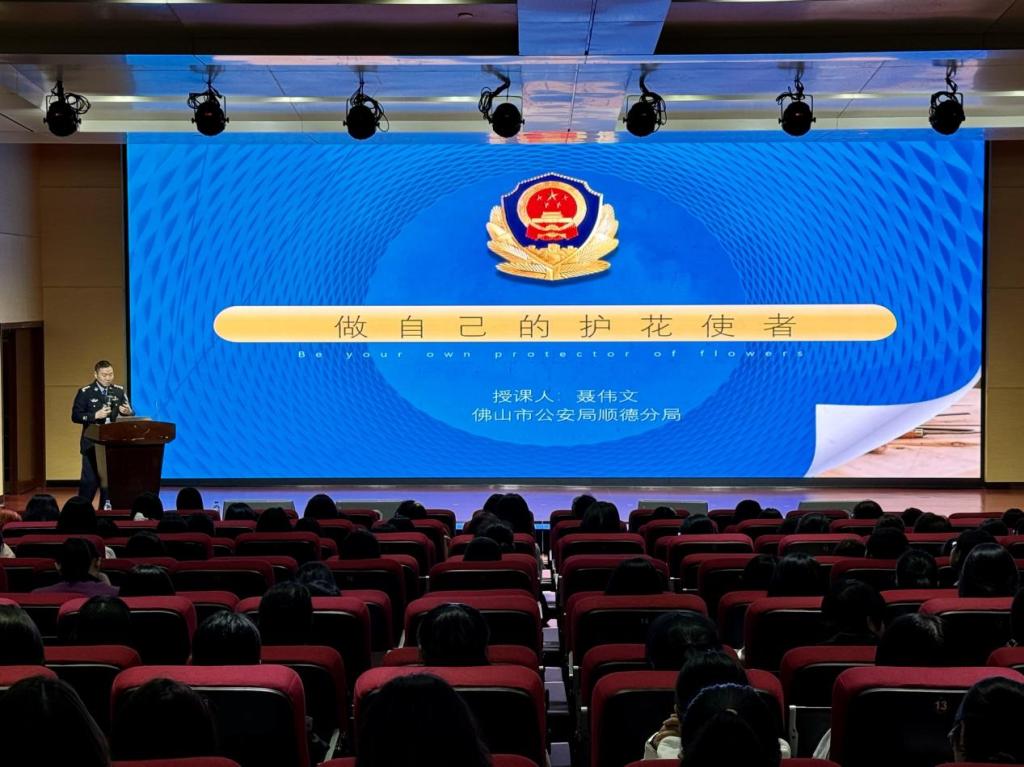 12月10日晚,太阳官网在六号报告厅举办《做自己的护花使者》法制教育专题讲座。讲座由佛山市公安局顺德分局容桂派出所警官聂伟文主讲,太阳官网在校女学生约300人以及心理咨询中心教师参加讲座。