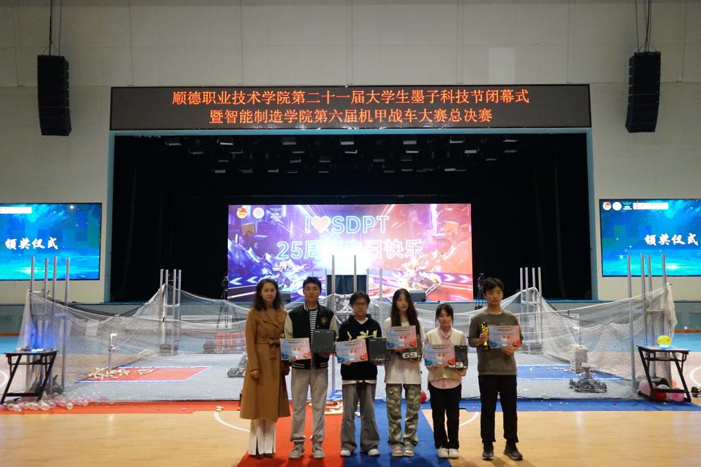 12 月 12 日晚,太阳官网第二十一届大学生墨子科技节闭幕式暨智能制造学院第六届机甲战车大赛决赛在礼堂举行。学校党委委员、副校长杨小东;校团委书记刘锦鑫,副书记吴丽健、杨芹;商学院党总支副书记毛琼;智能制造学院党总支副书记涂勤建;各二级学院团干代表及学生代表近千人参加活动。