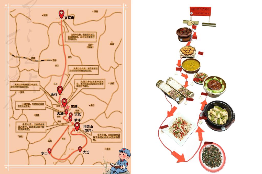 为了让红色故事“带得走、传得开”,团队还绘制了《舌尖上的历史对话》菜品绘本。翻开书页,每道菜的“前世今生”清晰呈现,比如“蒸红薯”页配历史事件《三湾改编》的插画,讲述当年毛泽东同志取消军官小灶、规定官兵同灶,以“不拿群众一个红薯”的铁纪,筑牢军民鱼水情的往事。