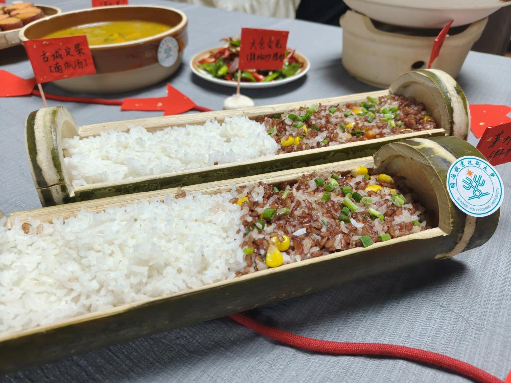 其中,“顶流”当属竹筒红米饭。团队巧思用糯米替代当年混在红米饭里的沙子,既保留历史质感,又兼顾适口性;更别出心裁设计“左右双拼”——左侧是承载革命岁月的红米饭,右侧是象征当下幸福的白米饭。体验者从左至右品尝,“由苦到甜”的味觉转变,将岁月变迁具象化,比言语更动人。以井冈山翠竹为容器,不仅复刻了当年红军“就地取材”的生存智慧,还让米饭浸润着清新竹香,成为众人争相打卡的“忆苦思甜红米饭”。