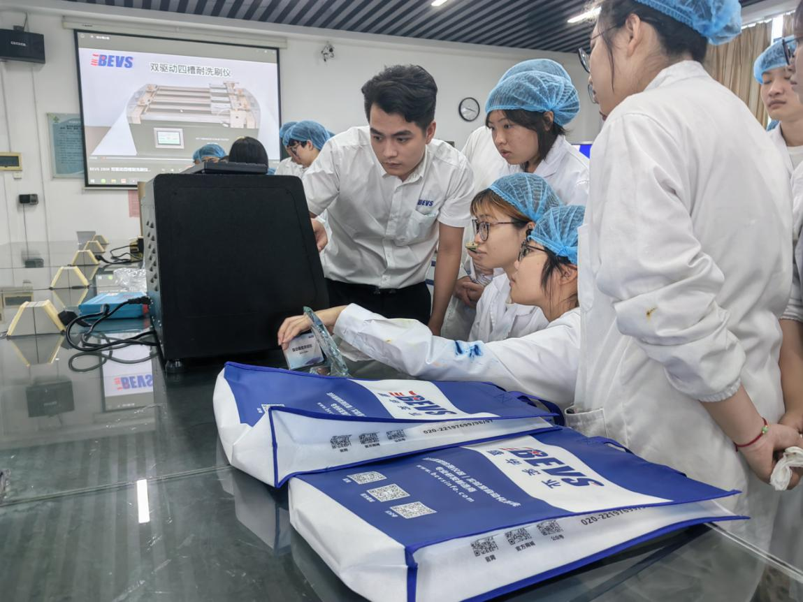 理论讲解结束后,广州盛华实业的技术团队接过“教学接力棒”,围绕8台套智能化设备展开沉浸式示范教学。现场亮相的自动耐沾污测试仪、双驱四槽耐洗刷仪、AI磨耗试验仪等设备,不仅符合国家及国际检测标准,更融入了AI语音控制、物联网数据采集、视觉分析识别等前沿技术。在双驱四槽耐洗刷仪操作演示中,技术人员展示了设备“自动完成1-99999次洗刷循环”的功能,通过实时数据投屏,让学生直观看到不同涂料样品在洗刷过程中的性能变化;AI磨耗试验仪则凭借“磨耗数据自动计算、损耗程度可视化”优势,将传统需要数小时的测试流程压缩至30分钟内,大幅提升教学效率。在学生分组实操环节,技术人员手把手指导,从试板固定、参数设置到结果读取,全程规范操作细节,帮助学生快速掌握智能化设备的使用逻辑,解决“课本知识不会用”的痛点。